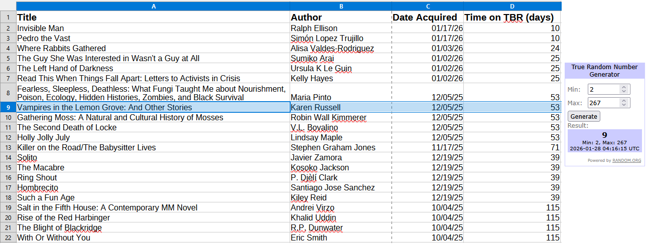 And my usual local book store, Inkwood Books in Haddonfield, had a winter sale so I picked up “Pedro the Vast” by Simón Lopez Trujillo and “Invisible Man” by Ralph Ellison. Well and I also picked up a lot of socks from the brand Gumball Poodle. I’ll let you have fun guessing which caught my eye the most.